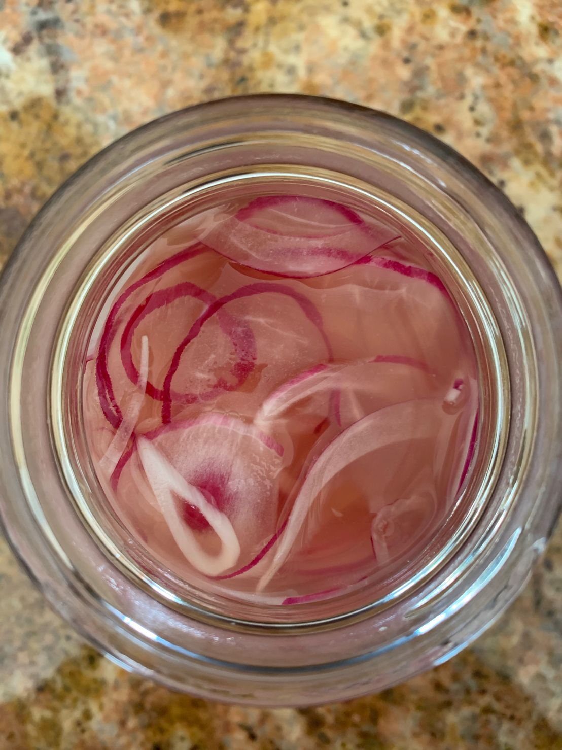 After getting inspired by pickled red onions on my avocado toast a few weeks ago, I decided to try it on my own. It was a success! Here’s how I made them. (All amounts are approximate) dissolve in about a cup of warm water: 1 tablespoon of sugar, 1 teaspoon salt and 1 cup Apple cider vinegar. Thinly slice 1 red onion (we all know it’s really purple) I used a mandolin at the thinnest setting. Put the sliced onion in a jar and cover with the vinegar. Let it set for about and hour and Voila!